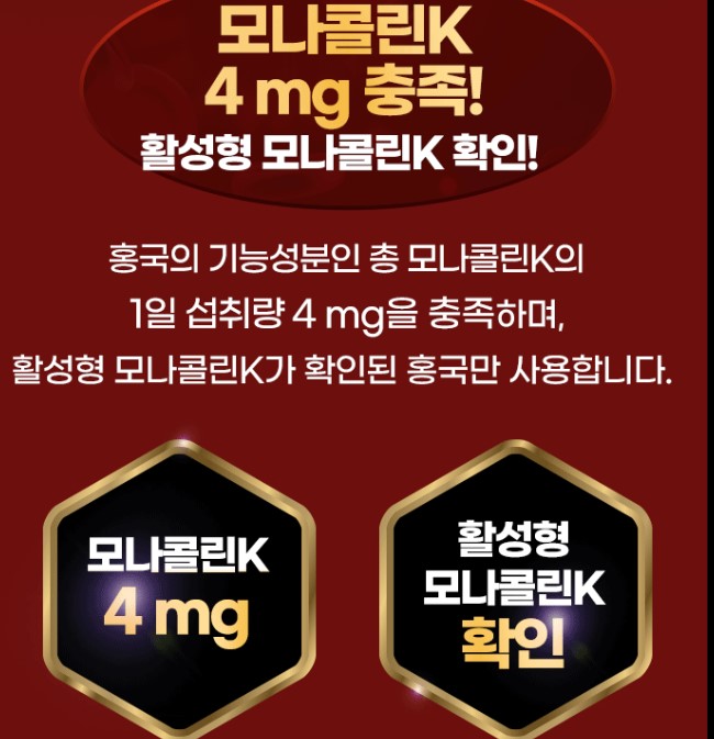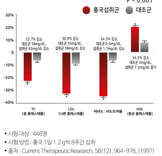 기능성 원료인 홍국(모나콜린 K)의 인체적용시험 결과 총 콜레스테롤 감소하였으며 그중 혈중 LDL(나쁜 콜레스테롤)은 감소하였으며 혈중 HDL(좋은 콜레스테롤)은 증가하였습니다.
