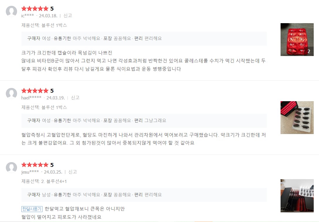 후기를 보면 여러 가지 질병에 도움이 되는 거 같아서 더 좋은 거 같습니다. 친정엄마가 당뇨, 혈압 등 성인병을 많이 가지고 계신데 보통은 따로따로 챙겨야 하는 경우가 많은데 같이 도움을 줄 수 있어서 더 좋은 거 같습니다.