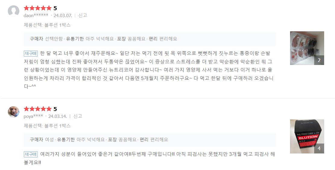 뉴트리코어 블루션의 후기를 보면 대부분 만족하고 있으며 재구매 역시 많이 되고 있습니다.