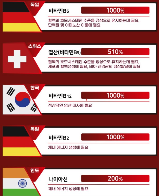 ○ 엽산 : 혈액의 호모시스테인 수준 정상 유지, 세포와 혈액생성, 태아 신경관의 정상 발달에 도움을 줄 수 있습니다.