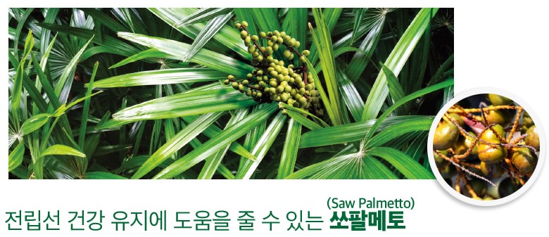 쏘팔매토는 가뭄과 해충에 강하고 불에도 거의 파괴되지 않는 생명력을 가지고 있습니다. 이런 쏘팔메토에서 추출한 로르산은 생리 활성 기능 성분으로 '전립선 건강의 유지에 도움을 줄 수 있음'을 인정받았습니다